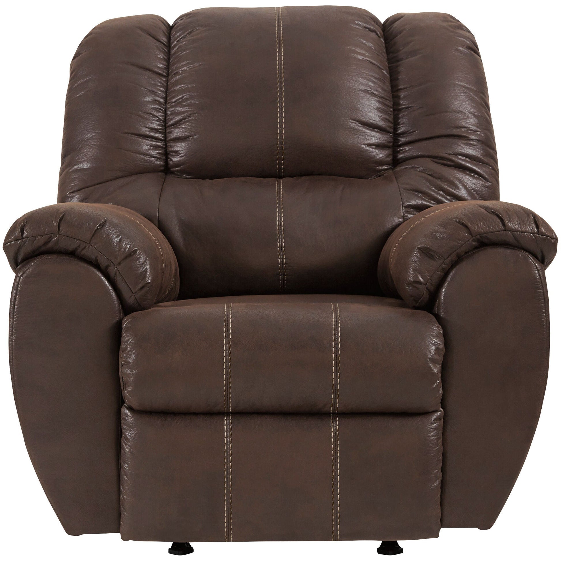 One look and you'll know the McGann rocker recliner puts comfort first. This leather-look fabric recliner has sumptuously thick cushioning and a one-pull reclining motion with infinite comfort positions, so you'll have no trouble finding your comfort zone. Quality construction features include a corner-blocked frame with metal reclining mechanism, and foam cushions wrapped with low-melt fiber. Jumbo topstitching highlights the rich look of this soft leather-look recliner. Polyester/polyurethane upholstery.